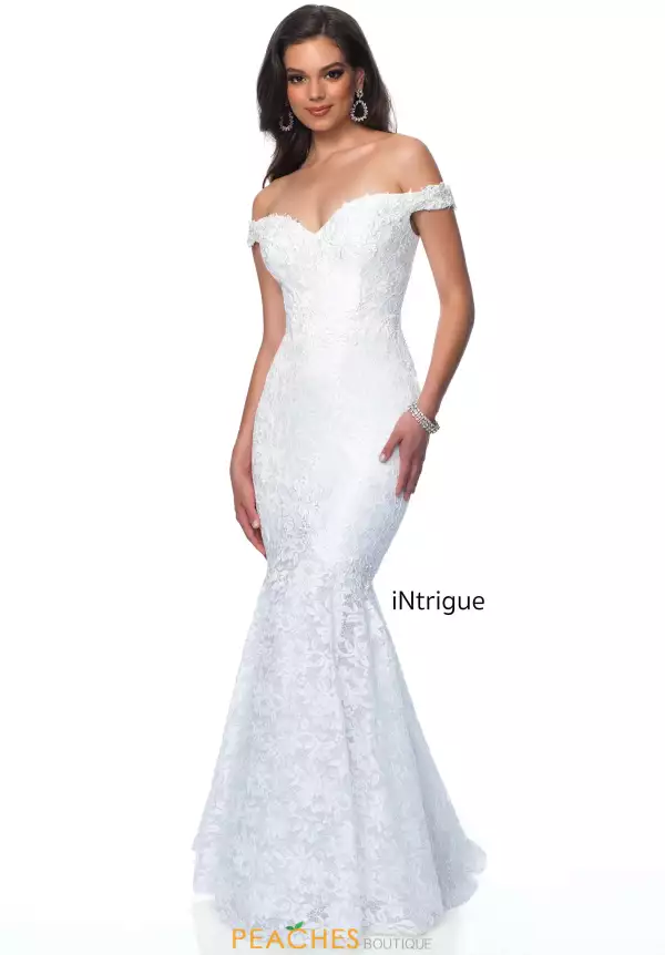 Ultra chic lace dress style 425 from Intrigue by Blush will hug your figure beautifully, perfect for your next upcoming event. This gown showcases a romantic off the shoulder neckline with cap sleeves and a subtle sweetheart detail. The long fitted silhouette is a stunning mermaid fit made in an elegant lace material that is beaded throughout, find this and more at Peaches Boutique. * This dress is excluded from our price match.