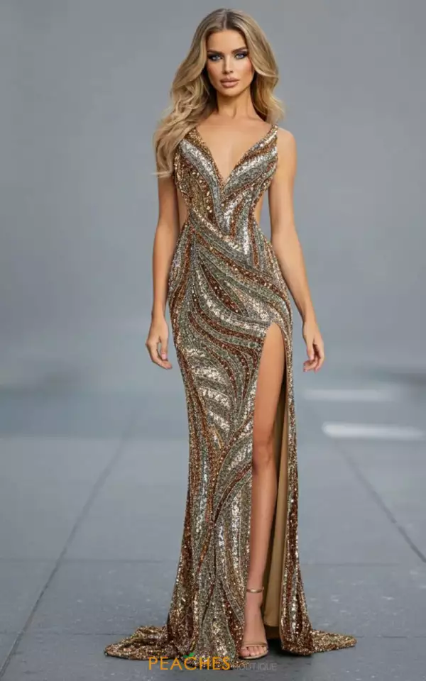 Fascinate all whom lay eyes on you in remarkable long style 47793 by Jovani. The alluring v neckline and enticing open back are complimented with a thigh high slit. Intricate swirls of impeccable beadwork decorate the entire fitted silhouette and finish with a lovely train to follow you perfectly all night long.