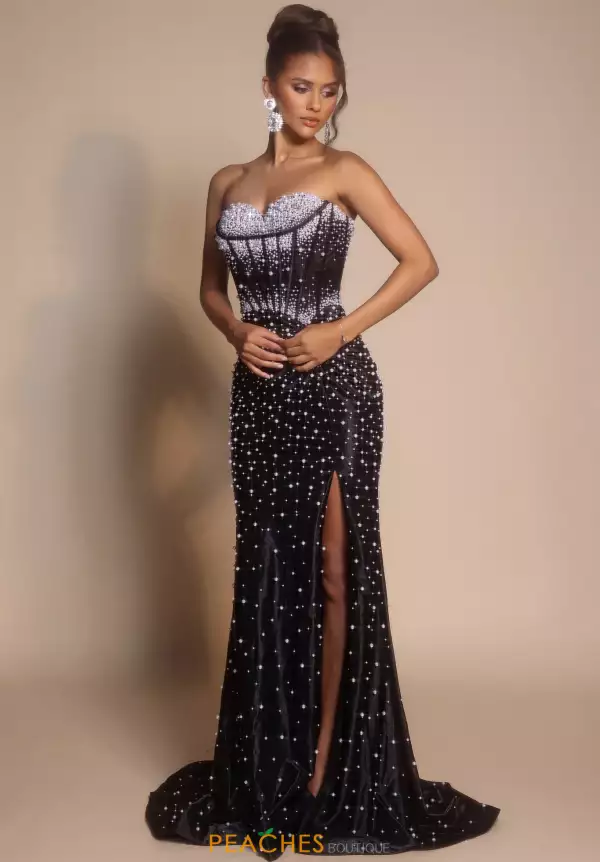 Radiate like sunshine at your next social occasion in this stunning Portia and Scarlett long dress style PS26002 made in gorgeous satin colors embellished richly with pearls and crystals throughout. This absolutely fabulous gown showcases a strapless, illusion corset with visible boning and low back with zipper closure. The long slim skirt has ruching on the hips with a high front side slit and back sweep train.