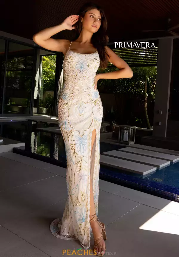 Be the center of attention at your next special event in stunning Primavera style 4156, showcasing a mosaic of jaw dropping and intricate beading patterns that coalesce beautifully. Slim straps lead to an appealing open lace up style to also cinch the waist. Complete with a classic side slit and a train.