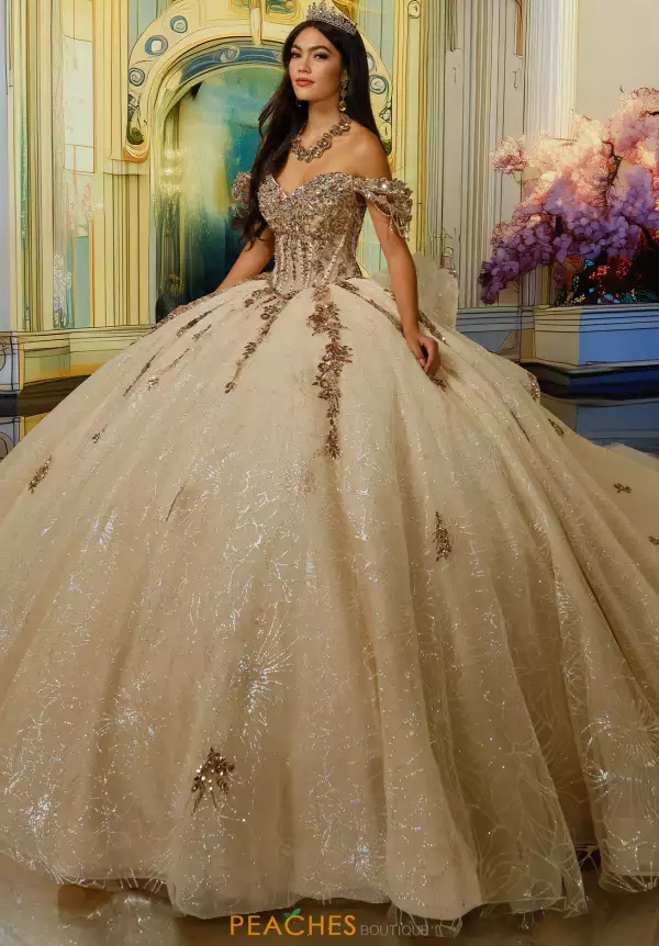 Feel like a modern day princess in this Princesa Quinceanera ball gown PR30191. This ball gown showcases detachable off-the-shoulder straps and separate shoulder straps. The bodice is bedazzles with gold beading and sequins. The full ball gown skirt has pockets with cracked ice glitter material a long with a detachable train and detachable bow in the back. A caplet is included.