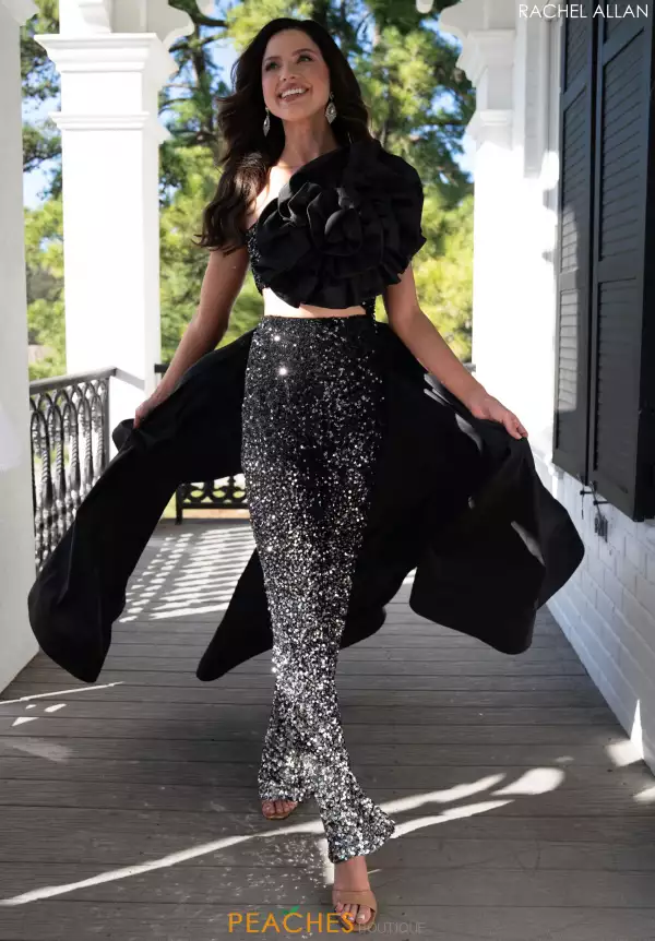 Leave everyone speechless when you show in this striking two piece from Rachel Allan Pageant, style 50335. This fabulous two piece features a stunning single shoulder neckline that beautifully highlights 3D ruffles. Add a unique flair with this overskirt made of Taffeta, it'll sway perfectly as you walk. This two piece set is completely covered in sequins, creating a stunning ombre effect.