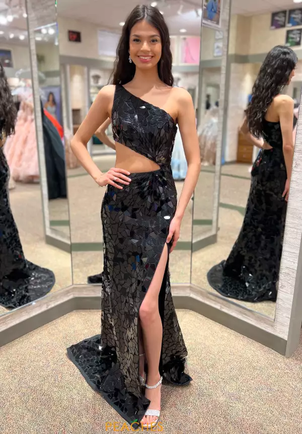 Shine the night away in dazzling long dress 55383 by Sherri Hill. This dress is phenomenal and adorned with geometrical cut glass beads that shine vibrantly when the light reflects off of them. The fitted silhouette flaunts a trendy midriff cutout that will up the antics at your event. Feel secure with an asymmetrical neckline and feel classy with a thigh high slit and train.