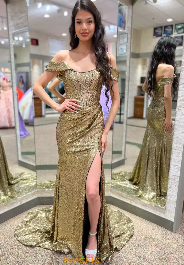 Look like modern day royalty in statement making long dress 55418 by Sherri Hill. From top to bottom this dress is entirely covered in glistening sequins that are sewn to perfection. The fitted bodice displays a strapless neckline with off the shoulder cap sleeves to up the elegance. The skirt is completed with a thigh high slit and a train.