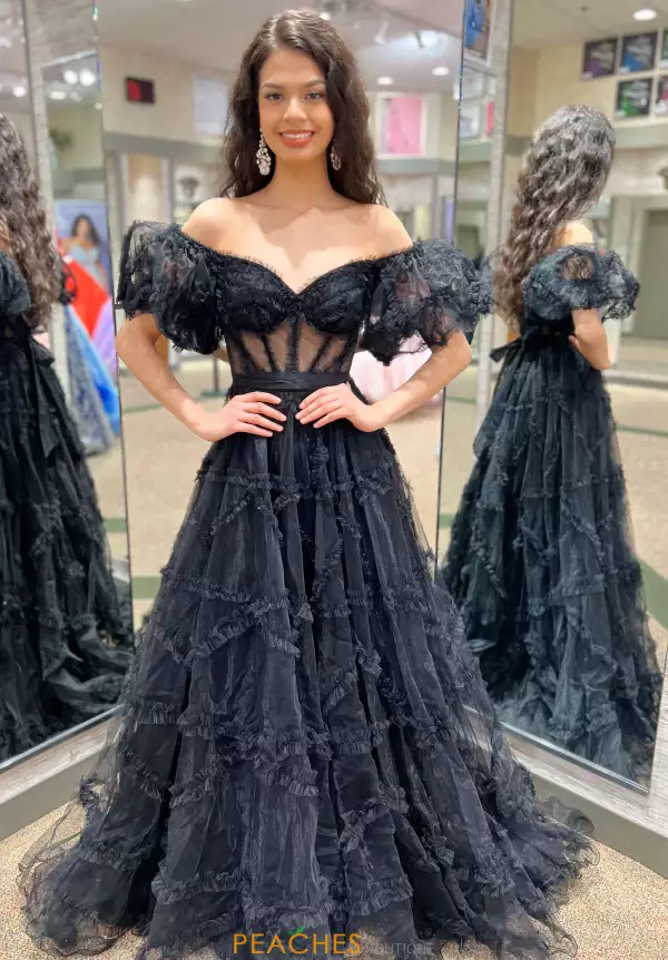 Leave an everlasting impression with this delightful Sherri Hill dress 55558. Showcasing an off the shoulder neckline with lovely, puffed cap sleeves, this stunning a line dress is perfect if you want to stand out. Fitted, see through corset bodice is complemented by the ravishing tier tulle skirt.
