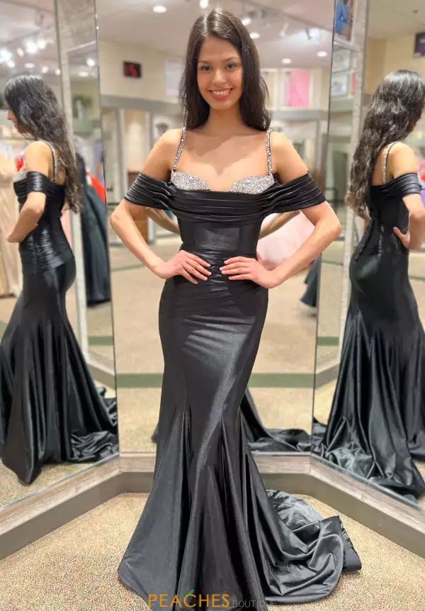 Feel like you just stepped off the red carpet in this amazing Sherri Hill dress 55593. The fit and flare silhouette dress has a gorgeous sweetheart neckline with rhinestone beadwork that peeks through the cowlick detail. The off the shoulder cap sleeves and thin sparkling beaded straps complement the fitted jersey style.