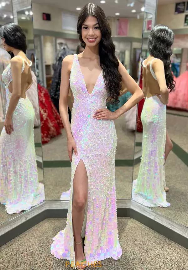 Glisten wonderfully all night as you wear the illuminating long style 56069 by Sherri Hill at your up coming prom. The gorgeous dress features a v neckline and is paired with an alluring sexy open back and a matching eye catching thigh high slit. Shimmering sequin decorates the entire gown from top to bottom and will have you sparkling from miles away.