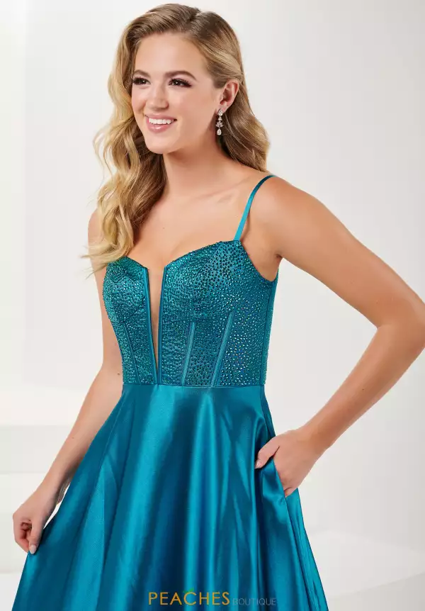 Dance the night away in this marvelous Tiffany dress 16101. Flattering on all figures, this charming a line silhouette features a plunging v neckline with a sheer insert panel and comfortable straps. Radiant stones beads adorn the fitted bodice accentuating your curves beautifully. Made in a sleek satin fabric, the a line skirt showcases playful pockets that add a dashing touch.