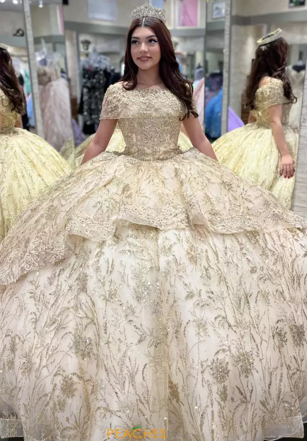 Be the belle of the ball in this gorgeous Valentina by Vizcaya ball gown 34055. This sweetheart neckline dress has a lace up back. An over the shoulder stole is detachable. The ball gown skirt flows from the waist line and showcases a detachable skit to give it that high low style. Embellished with glitter and lace appliques, this dress is a true stunner.