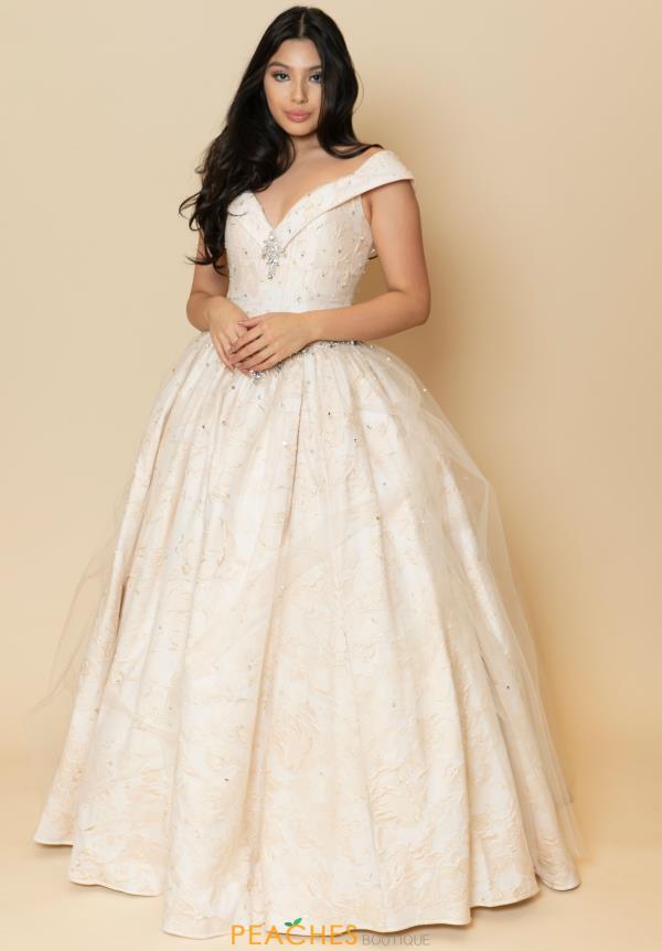 Feel like a princess in this magnificent ball gown 60051. This divine dress features an off the shoulder neckline with brocade and beading throughout the bodice. This leads to a corset lace up back and a full skirt. Dazzling beads are scattered throughout the skirt to add some shimmer to the night. Shop for more Valencia dresses at Peaches Boutique.